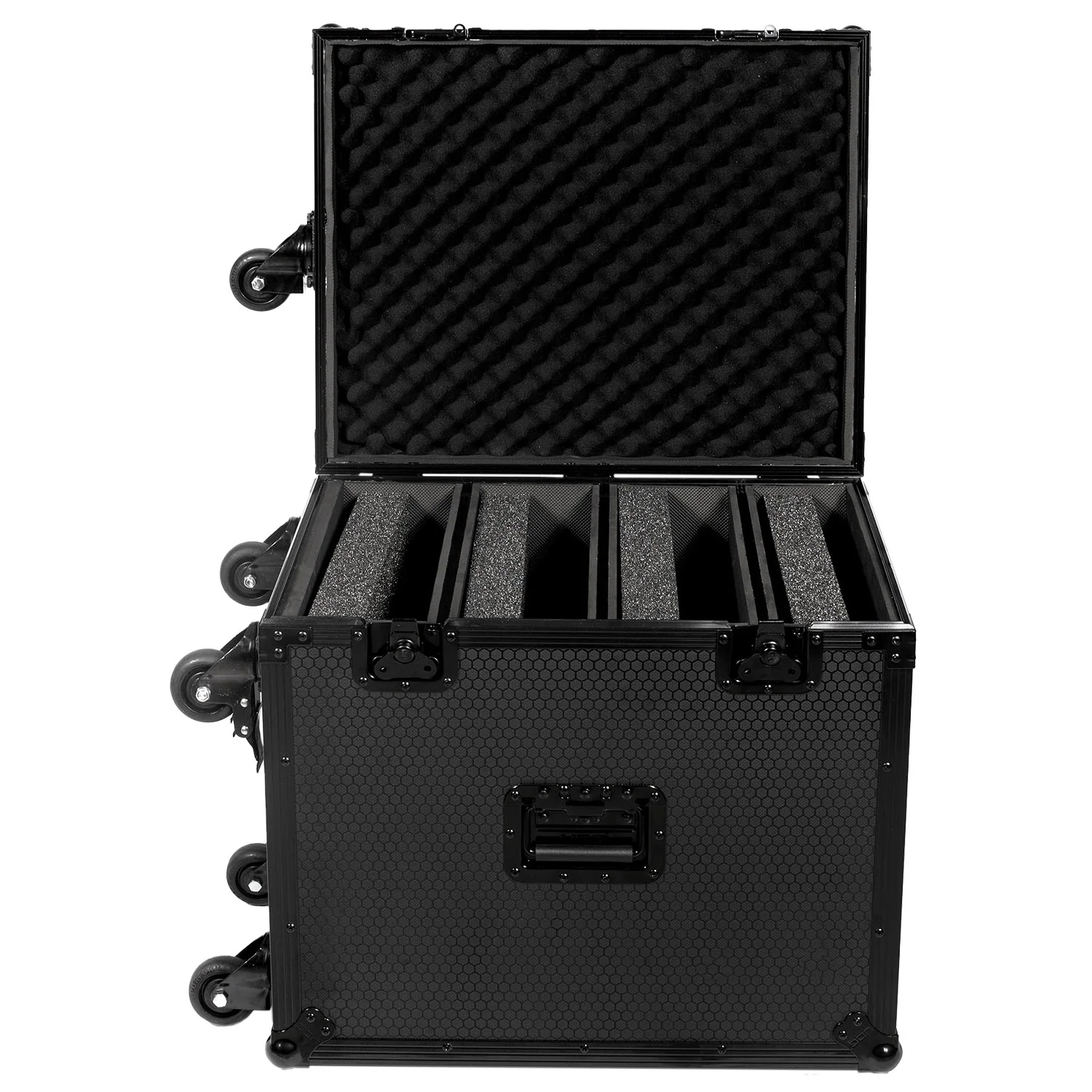 UDG have further fined-tuned already a great design concept of our flight case into one specially for the most discerning DJ/producer. Constructed from solid 9mm thick plywood, the outside is laminated in a black finished honeycomb/hexagonal “Stage Grip” pattern. The inner sides are protected with high density diamond embossed EVA foam protective padding. This extremely robust padding protects the equipment against scratches, dust or other damages, creating a unique stylish & practical finish.